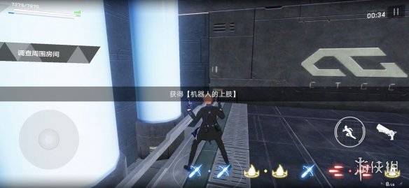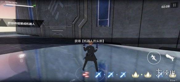 然後我們根據提示移動到後邊的房間,進入房間會刷新出三隻小怪,我們根據之前的提示100先解決掉右邊和中間的兩隻,僅留下最左邊的一隻,然後機器人便會發生不穩定,自爆,自爆完之後,會在原地留下一個光圈,我們走進關圈,便可以獲得一個名為(機器人的上肢)。