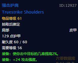 肩膀:強擊肩甲,出處,黑上老1火BOSS,三物理職業準畢業。26AP,2命中,強大到無以復加的屬性,是多少人夢寐以求的瑰寶。雖然這件裝備是個皮甲,但是也顧不瞭這麼多瞭,什麼薩滿,小德,騎士。也都心癢癢吧。