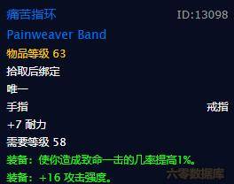 戒指:推薦前期去瑪拉頓找朋友代刷一個黑石戒指,AP+命中非常實惠。另一個戒指位推薦黑上達基薩斯將軍掉落的痛苦指環。但是醜話說到前面,這戒指的掉落並不高,而且一旦出貨之後,幾乎是所有能用的職業都會去搶,所以以免傷到和氣建議大傢在公會團內部消化。