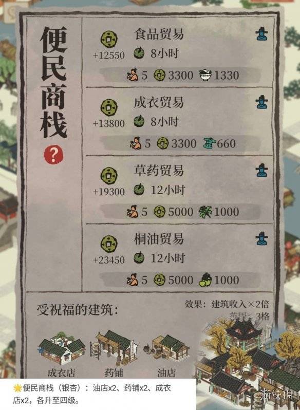 便民商棧(銀杏):油店x2、藥鋪x2、成衣店x2,各升至四級。