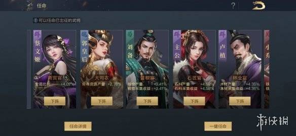 註:任命武將可獲得額外的資源產量加成,市場交易比例加成等效果,被任命的武將仍可參與出征。
