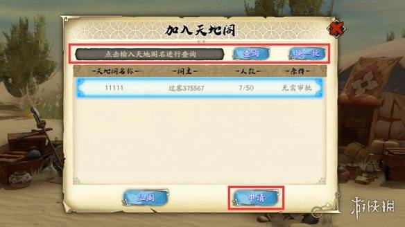 1、如果已經有了心儀的天地閣,可以在天地閣彈窗上方輸入心儀的天地閣的部分或全部名稱查詢。