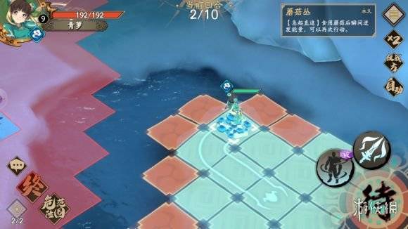 ①青蘿去踩法陣。②阿良走到這個位置。一定不能再往前一格,第一次進入這個關卡的玩家,大部分都會踩這個坑,向前一格會被小怪攻擊,遊戲結束。站這個位置正好下回合可以踩蘑菇。