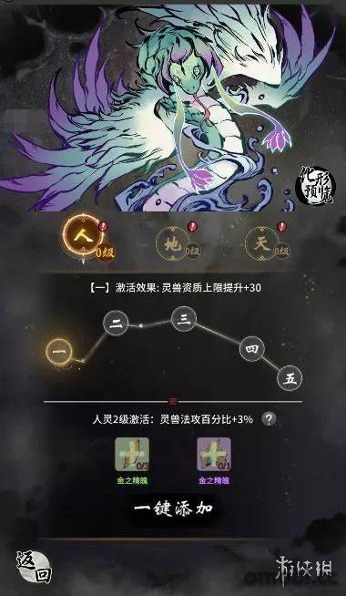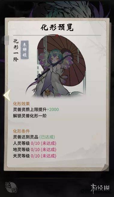 打開靈獸界面就會發現有一個“化形”的小按鈕,如果靈獸符合化形條件,即可擁有化形機會,如果沒有,也可以預覽到靈獸化形的形態。