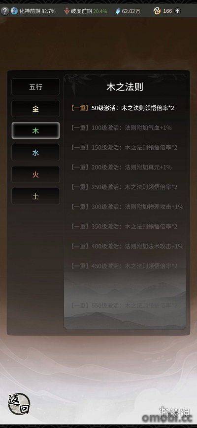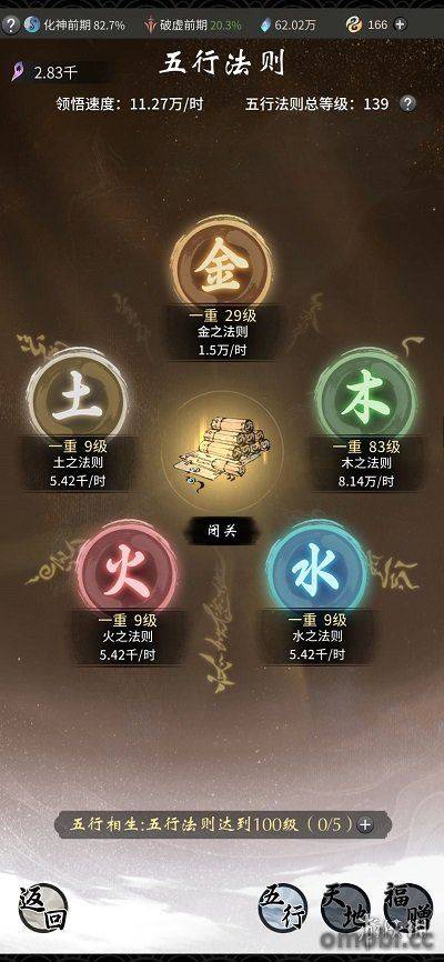 五行法則的主頁面,可以看到金、木、水、火、土五種法則,每一種法則的底下會有一個每小時能夠獲取多少多少東西的標志。