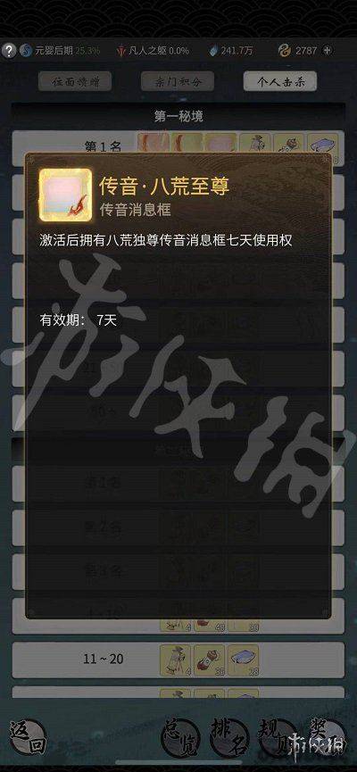 個人擊殺第一名可以額外獲得光環·八荒至尊、相框·八荒至尊、傳音·八荒至尊獎勵。