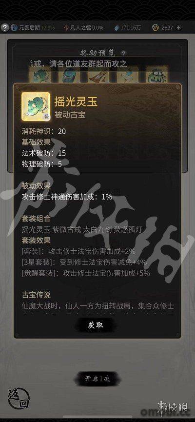 被動古寶:乾坤社稷圖中展出的被動古寶共有4件,分別為增強神通傷害的搖光靈玉、減免神通傷害的紫微古戒、增強法寶傷害的太白九劍,以及減免法寶傷害的熒惑孤燈。四件被動古寶的屬性不同,但開出率均為3.2%。