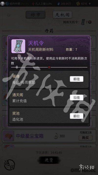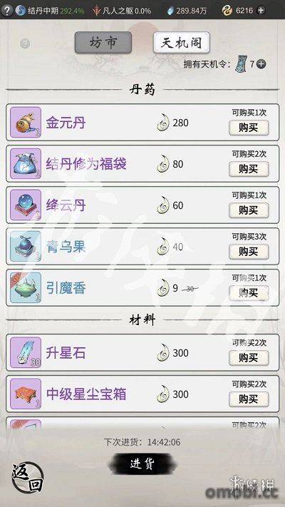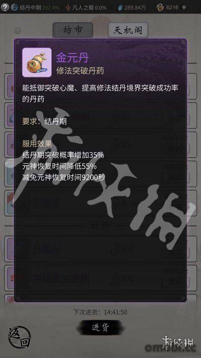 天機坊中可以買到色品質提升突破成功率的丹藥、增加修為的丹藥、永久提升屬性的丹藥和各類稀有煉器素材等等。