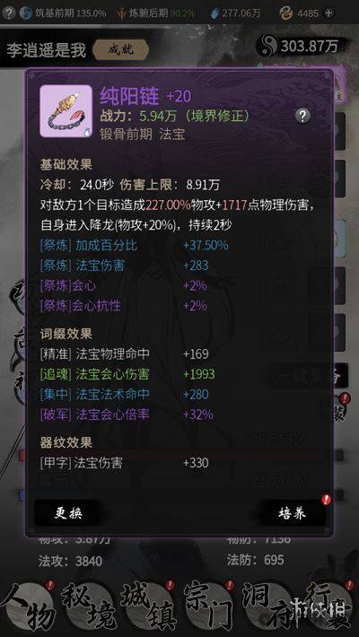 其中需要特別說明的是,法寶除了提供屬性以外,還會讓角色增加一個主動技能,效果會根據法寶類型而變化。因此除了追求更高品質的法寶以外,合理搭配不同種類的法寶會顯得更為重要。