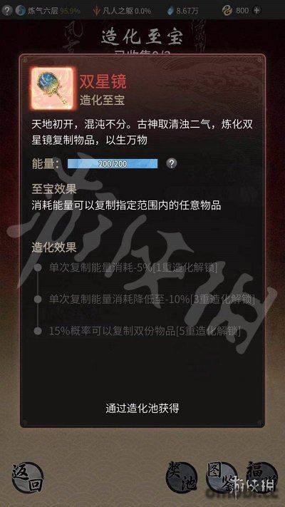雙星鏡目前只能通過消耗造化圖在造化池中獲得,只有0.25%的概率抽到。