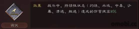 設伏:直接對持續性傷害有1個8%的增幅,比較典型的代表就是無當飛軍、于吉、朱儁、程昱、陸遜。