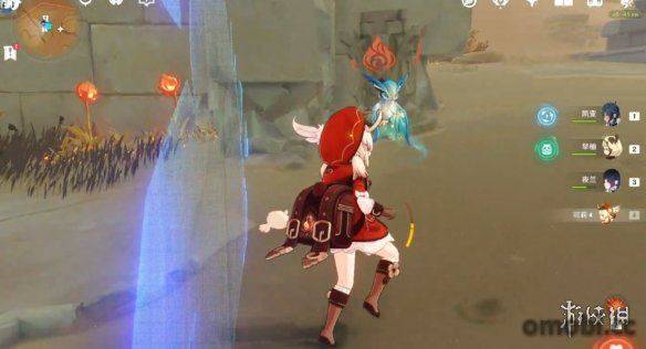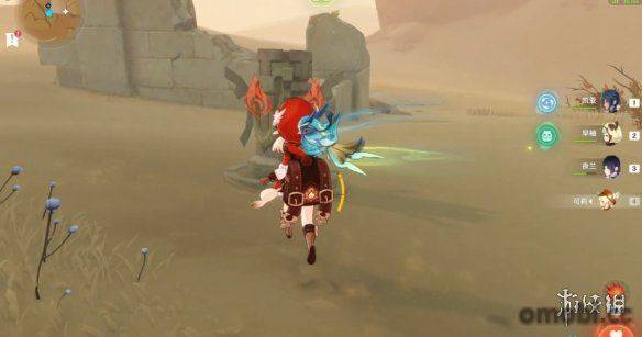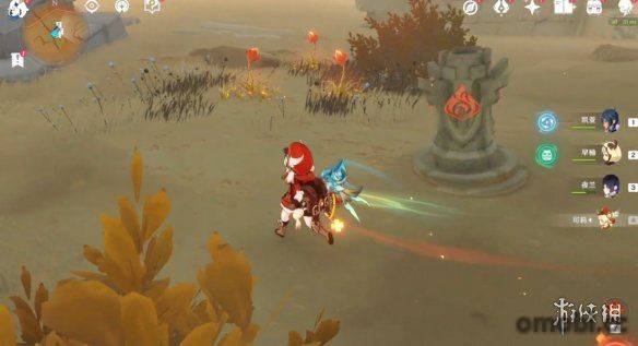 首先我們來到沙漠的西北角,正對著秘境的石碓,我們能看到在周圍有幾個火元素方碑,在方碑的周邊還有烈焰花蕊。