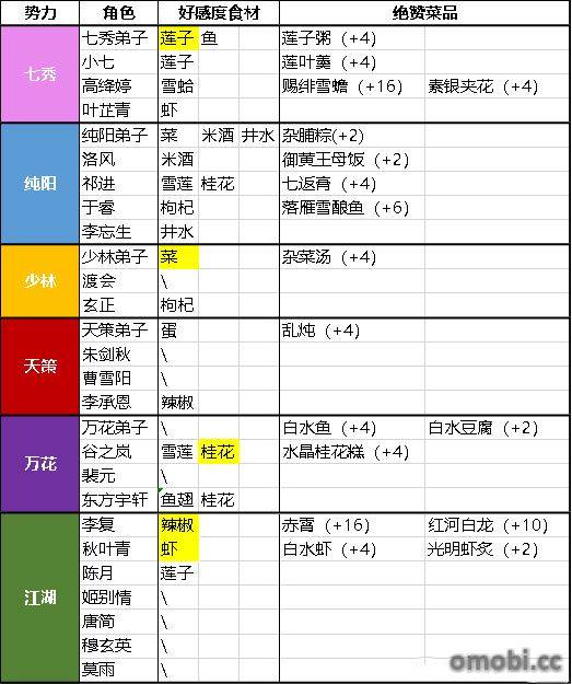 首页 » 指劍江湖 » 正文 指劍江湖 指劍江湖 絕贊食物觸發匯總 2022-09-28 0 分享 摸索了下各角色會觸發絕贊效果的菜品,總結了下規律跟他的身份和喜歡的食材關系比較大, 菜譜上的提示大部分都是無用的,很多角色并不會喜歡自己做的菜,也不喜歡別人給他做的菜。 專題:指劍江湖攻略 · 指劍江湖秘技 收藏0 讚0 分享
