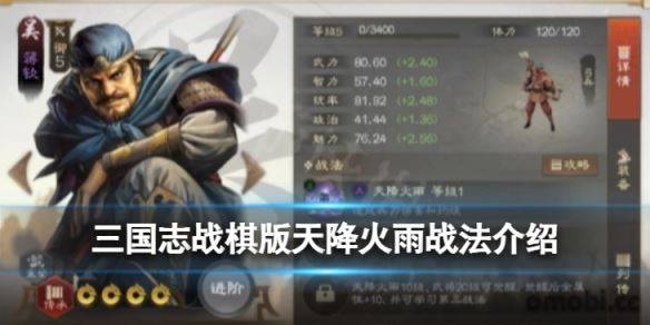 三國志戰棋版天降火雨戰法介紹為A級傳承戰法,擁有強力的技能效果,小編特地為大家帶來了該戰法的效果屬性圖,感興趣的小伙伴們就快來和小編一起看看這篇三國志戰棋版天降火雨戰法介紹。