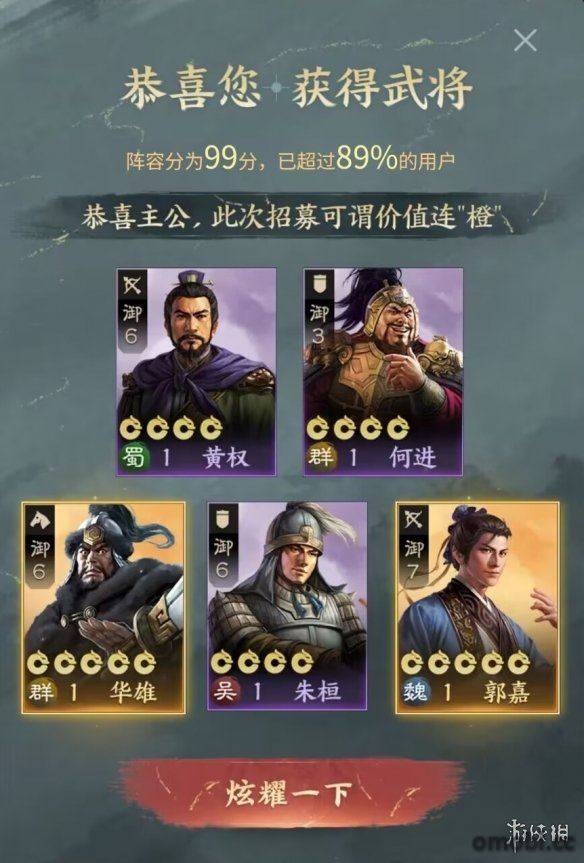 五連抽出橙概率為36.6%,最多連續招募4次必得橙將。