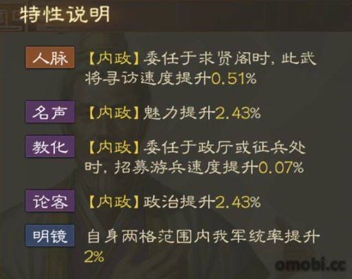 人脈 [內政]委任于求賢閣時,此武將尋訪速度提升0.51%