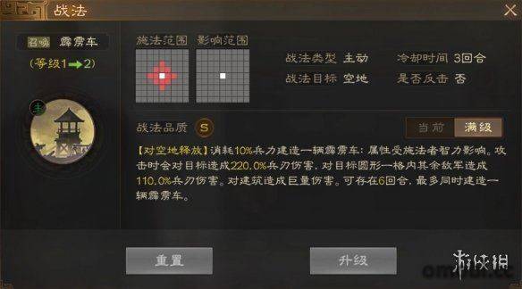 [對空地釋放]消耗10%兵力建選一輛霹靂車:屬性受施法者智力影響。攻擊時會對目標造成220.0%兵刀傷害.對目標圓形一格內其余故軍造成110.0%兵刃傷害。對建筑造成巨量傷害。可存在6回合,最多同時建造一輛霹靂車。