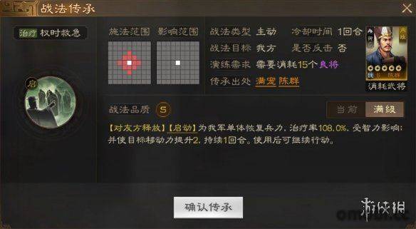 [對友方釋放] [啟動]為我軍單體恢復兵力,治療率108.0%,受智力影響:并使目標移動力提升2.持續1回合。使用后可繼續行動。