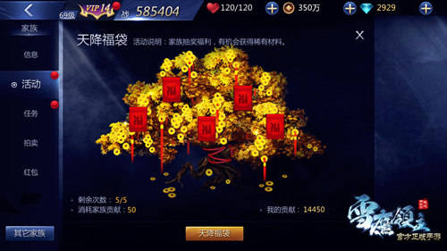 行走在異世,難免有需要用錢,卻不湊手的時候。此時,平時做傢族任務獲得的傢族貢獻就派上用場了!首先,《雪鷹領主》手遊玩傢可以用傢族貢獻參與“天降福袋”,獲取金幣及珍稀材料;其次,玩傢還可以在傢族商店換取魂石、夥伴升級材料等物品。另外,玩傢還能領取他人發放的“傢族紅包”,獲得神晶噢!