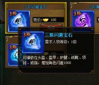 玩傢可在商城獲取三階閃避寶石,100元寶/個。